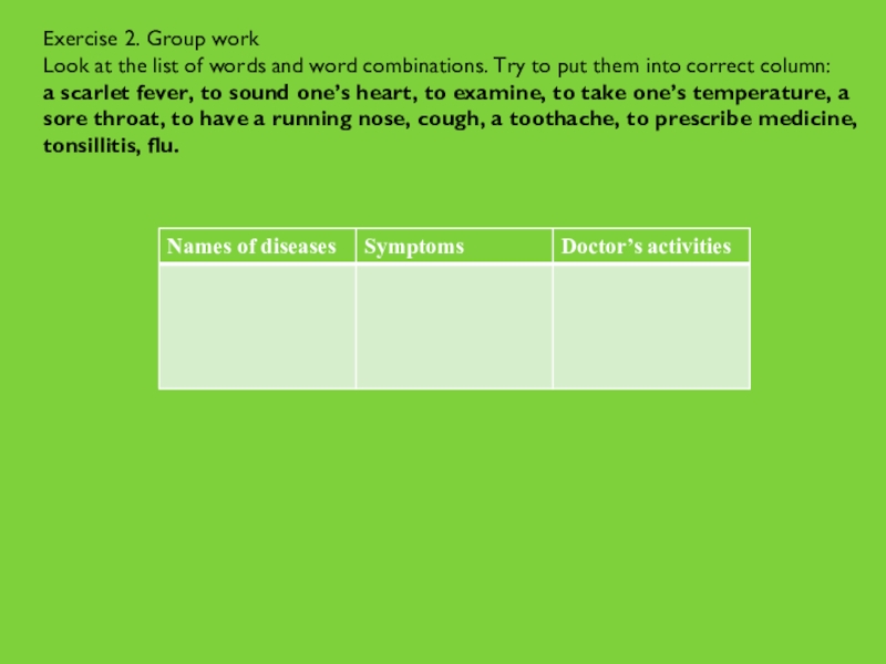 a scarlet fever, to sound one’s heart, to examine, to take one’s temperature, a sore throat, to have a running nose, cough, a toothache, to prescribe medicine, tonsillitis, flu.