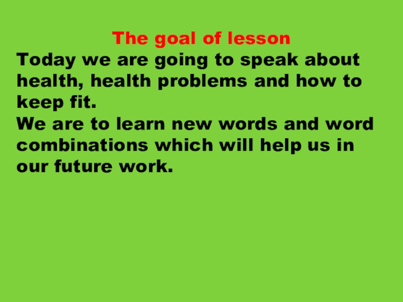 The goal of lessonToday we are going to speak about health, health problems and how to keep