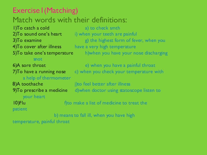 Exercise1(Matching)Match words with their definitions:1)To catch a cold       		a) to check