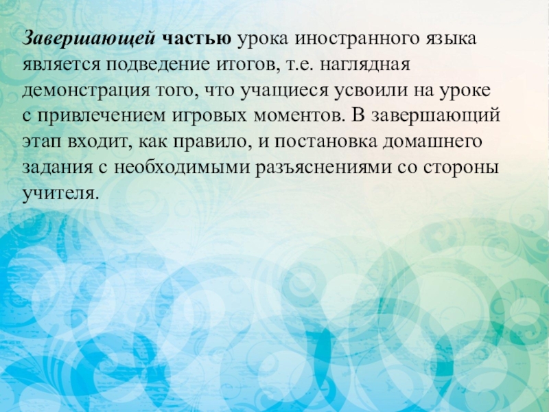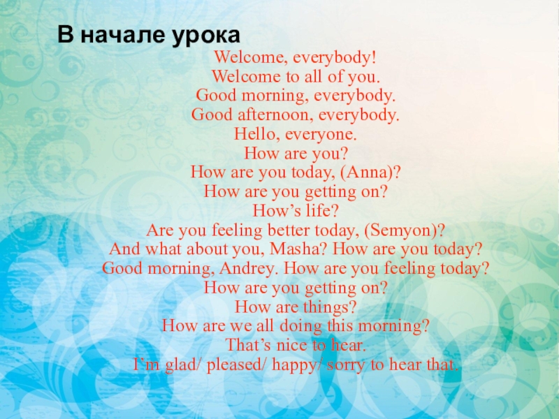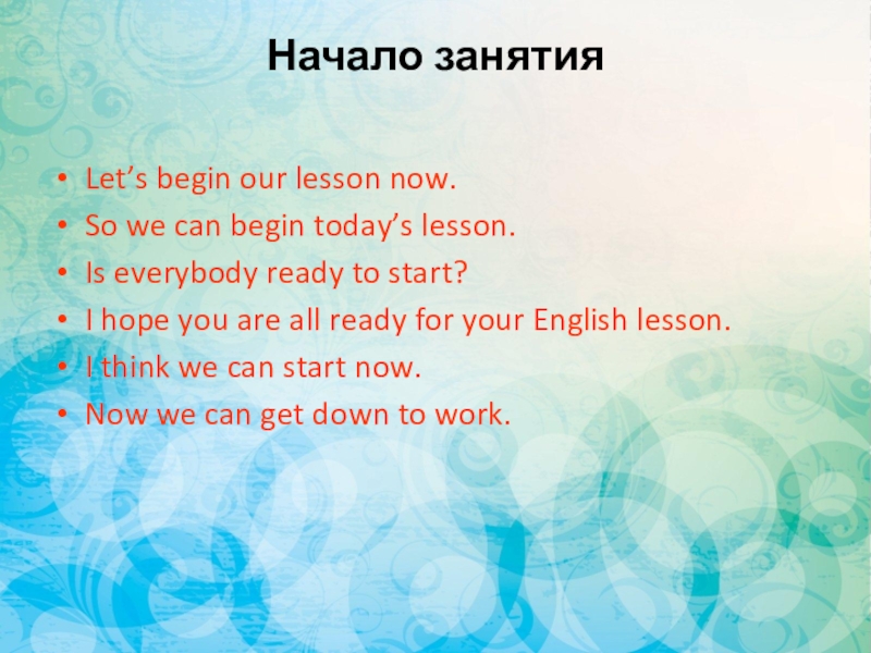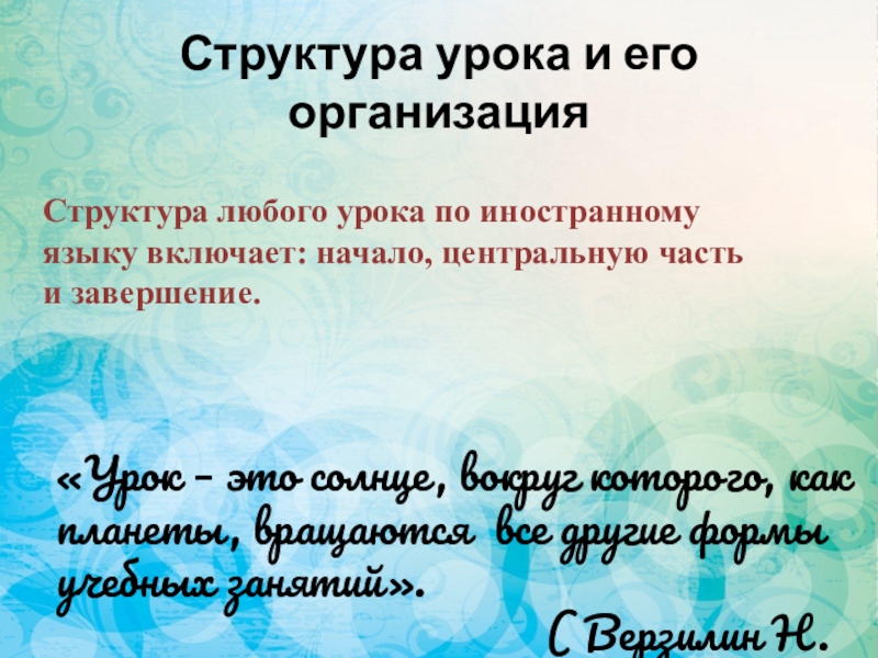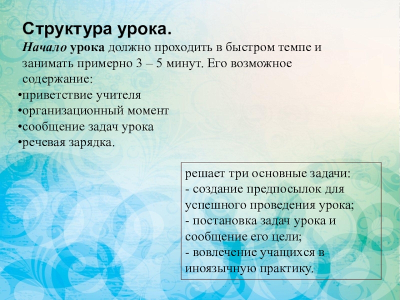 Структура любого урока по иностранному языку включает: начало, центральную часть и завершение.