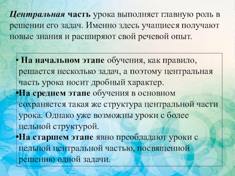 На среднем этапе обучения в основном сохраняется такая же структура центральной части урока. Однако уже возможны уроки с более цельной структурой.