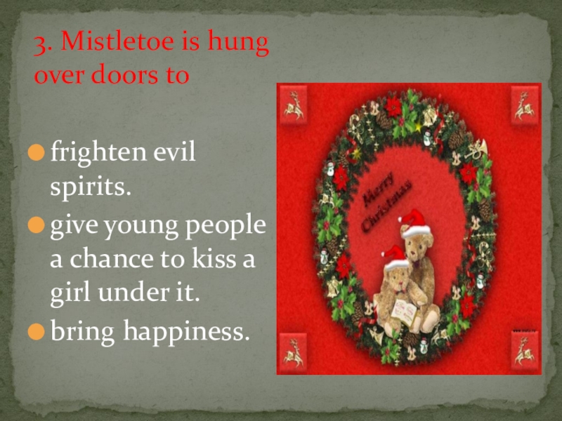 3. Mistletoe is hung over doors tofrighten evil spirits.give young people a chance to kiss a girl