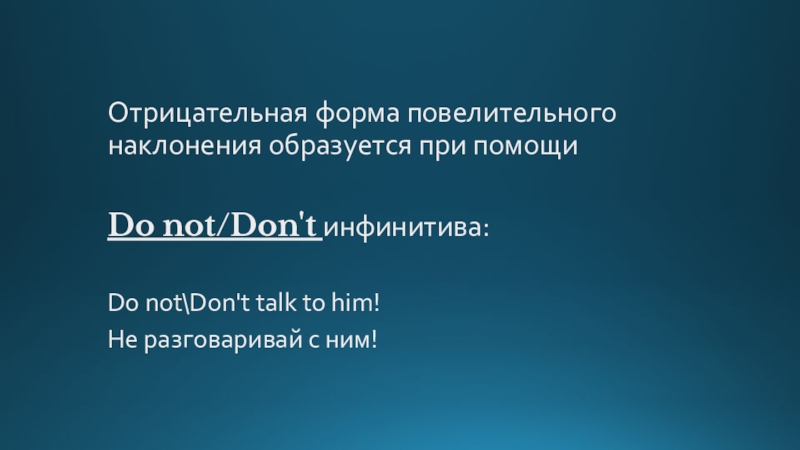Отрицательная форма повелительного наклонения образуется при помощи Do not/Don't инфинитива: Do not\Don't talk to him! He разговаривай