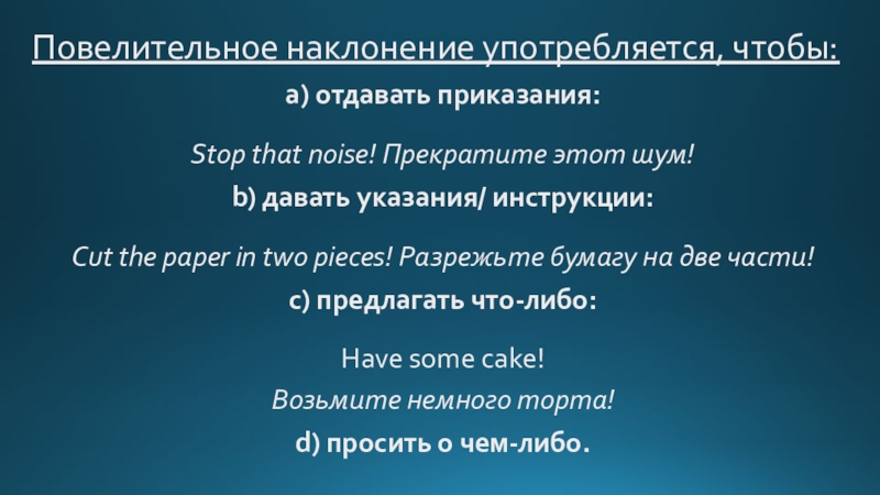 Повелительное наклонение употребляется, чтобы:а) отдавать приказания: Stop that noise! Прекратите этот шум!b) давать указания/ инструкции: Cut the