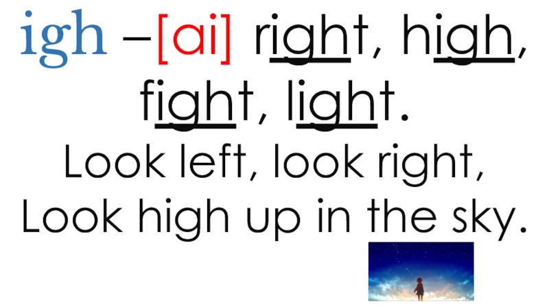 igh –[ai] right, high,fight, light.Look left, look right,Look high up in the sky.