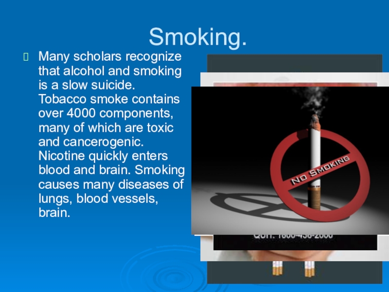 Tobacco smoke contains over 4000 components, many of which are toxic and cancerogenic. Nicotine quickly enters blood and brain. Smoking causes many diseases of lungs, blood vessels, brain.