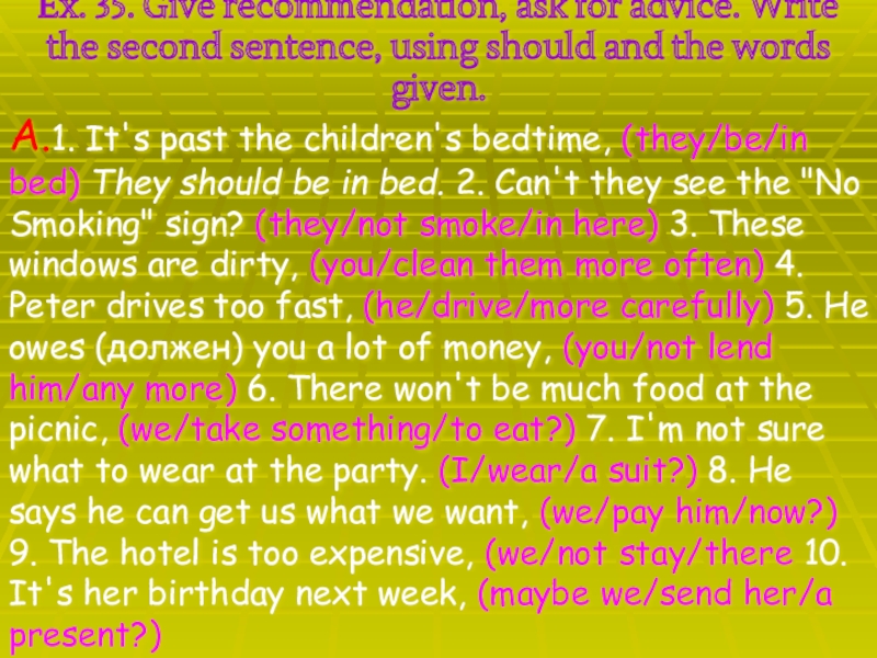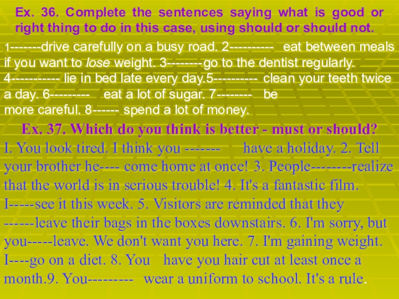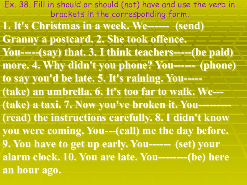 Слайд 24Ex. 38. Fill in should or should (not) have and use