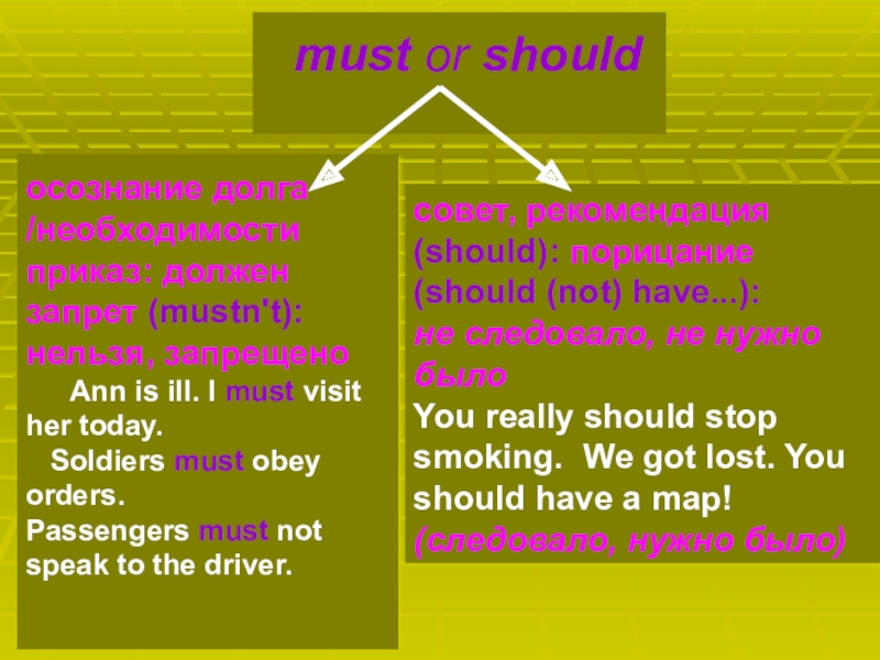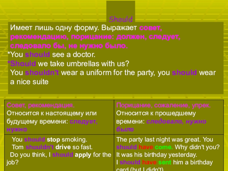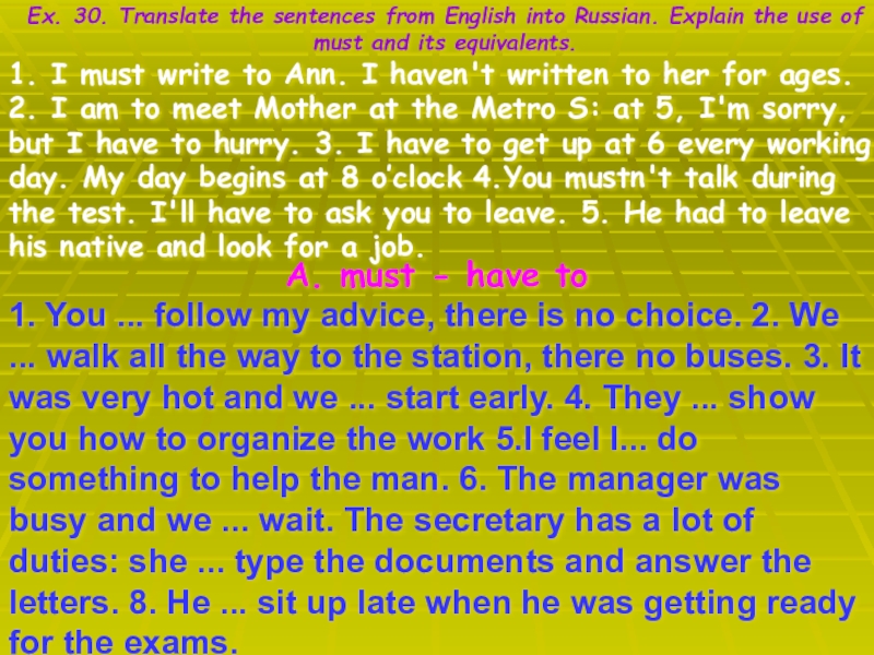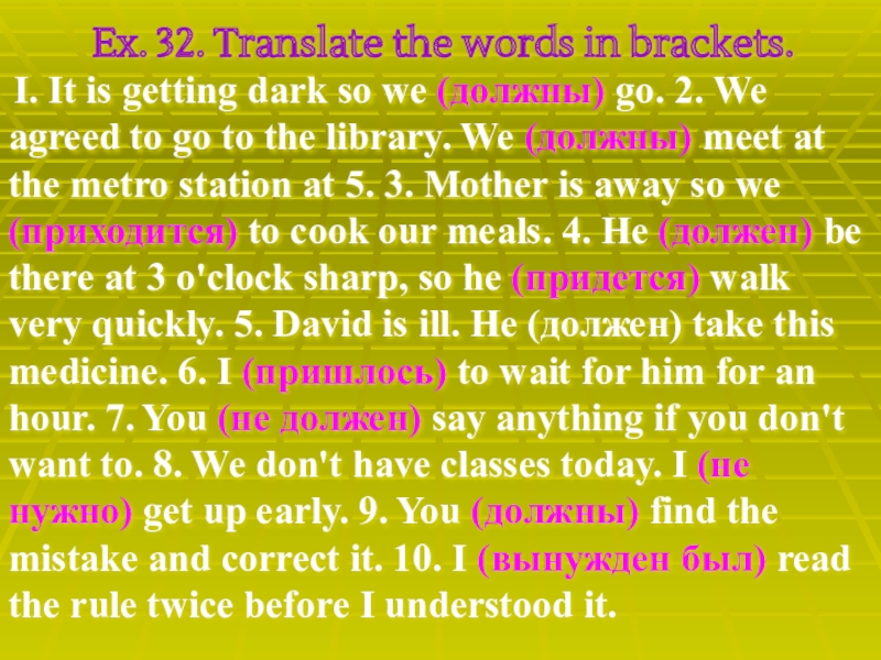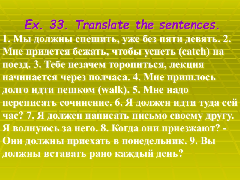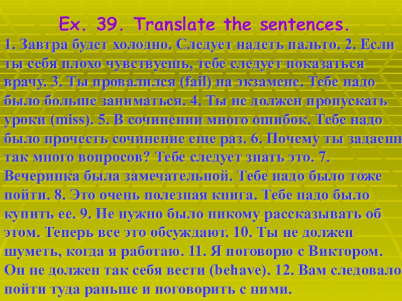 2. Если ты себя плохо чувствуешь, тебе следует показаться врачу. 3. Ты провалился (fail) на экзамене. Тебе надо было больше заниматься. 4. Ты не должен пропускать уроки (miss). 5. В сочинении много ошибок. Тебе надо было прочесть сочинение еще раз. 6. Почему ты задаешь так много вопросов? Тебе следует знать это. 7. Вечеринка была замечательной. Тебе надо было тоже пойти. 8. Это очень полезная книга. Тебе надо было купить ее. 9. Не нужно было никому рассказывать об этом. Теперь все это обсуждают. 10. Ты не должен шуметь, когда я работаю. 11. Я поговорю с Виктором. Он не должен так себя вести (behave). 12. Вам следовало пойти туда раньше и поговорить с ними.