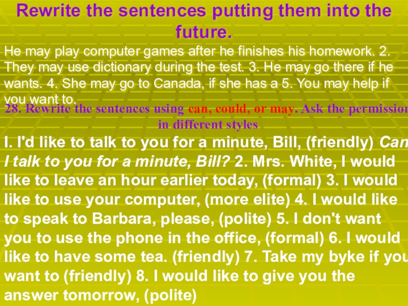 28. Rewrite the sentences using can, could, or may. Ask the permission in different styles