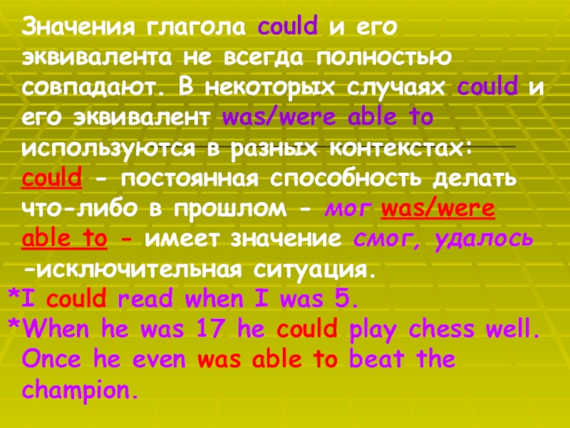 Значения глагола could и его эквивалента не всегда полностью совпадают. В