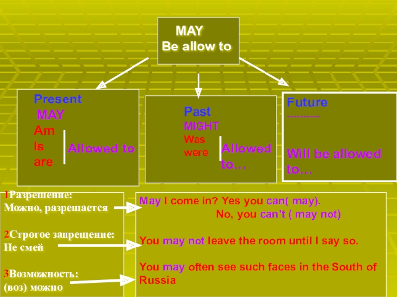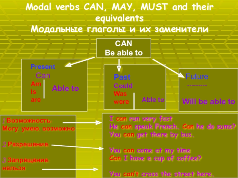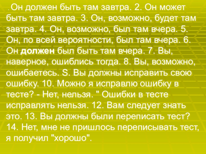 завтра. 3. Он, возможно, будет там завтра. 4. Он, возможно, был там вчера. 5. Он, по всей вероятности, был там вчера. 6. Он должен был быть там вчера. 7. Вы, наверное, ошиблись тогда. 8. Вы, возможно, ошибаетесь. S. Вы должны исправить свою ошибку. 10. Можно я исправлю ошибку в тесте? - Нет, нельзя. " Ошибки в тесте исправлять нельзя. 12. Вам следует знать это. 13. Вы должны были переписать тест? 14. Нет, мне не пришлось переписывать тест, я получил "хорошо".