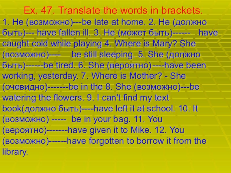 home. 2. He (должно быть)--- have fallen ill. 3. He (может быть)------ have caught cold while playing 4. Where is Mary? She (возможно)---- be still sleeping. 5. She (должно быть)------be tired. 6. She (вероятно) ----have been working, yesterday. 7. Where is Mother? - She (очевидно)-------be in the 8. She (возможно)---be watering the flowers. 9. I can't find my text book(должно быть)----have left it at school. 10. It (возможно) ----- be in your bag. 11. You (вероятно)-------have given it to Mike. 12. You (возможно)------have forgotten to borrow it from the library.