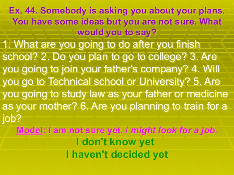 Слайд 31Ex. 44. Somebody is asking you about your plans. You have