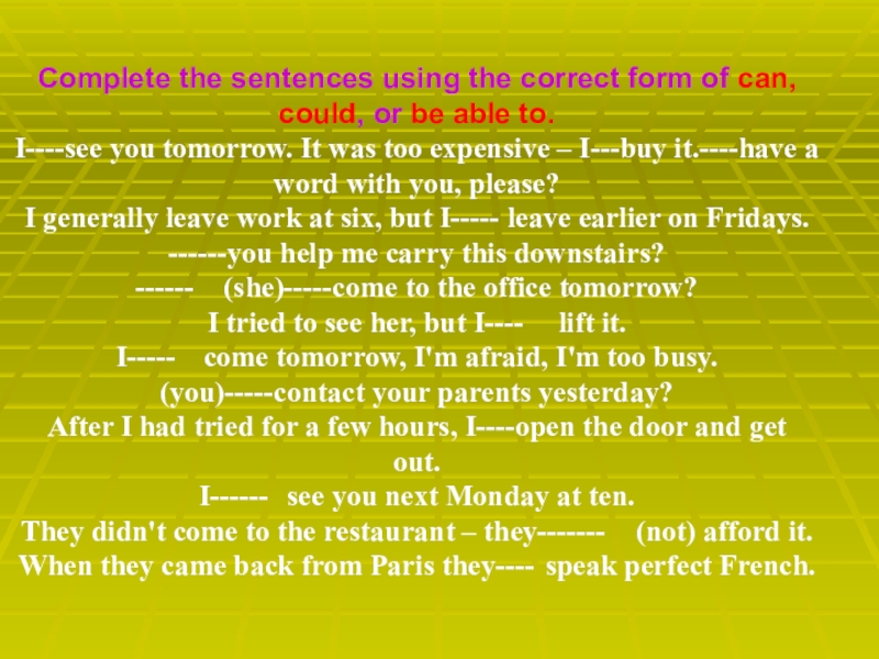 Слайд 7Complete the sentences using the correct form of can, could, or