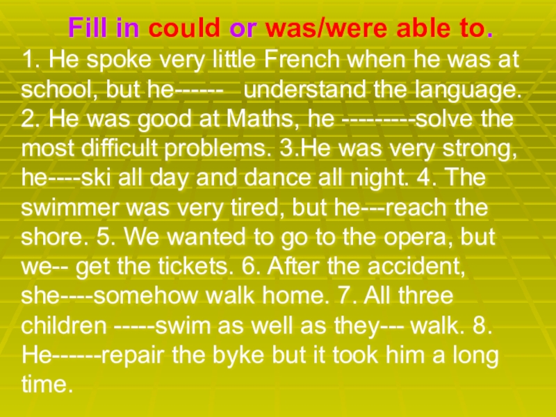 French when he was at school, but he------ understand the language. 2. He was good at Maths, he ---------solve the most difficult problems. 3.He was very strong, he----ski all day and dance all night. 4. The swimmer was very tired, but he---reach the shore. 5. We wanted to go to the opera, but
