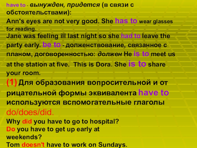 Jane was feeling ill last night so she had to leave the party early. be to - долженствование, связанное с планом, договоренностью: должен Не is to meet us at the station at five. This is Dora. She is to share your room.
