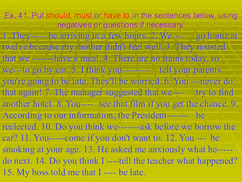 1. They----- be arriving in a few hours. 2. We---- go home at twelve because my mother didn't feel well. 3. They insisted that we -------have a meal. 4. There are no trains today, so we---to go by car. 5. I think you--------- tell your parents you're going to be late. They'll be worried. 6. You ---never do that again! 7. The manager suggested that we---- try to find another hotel. 8. You---- see that film if you get the chance. 9. According to our information, the President------- be reelected. 10. Do you think we-------ask before we borrow the car? 11. You-----come if you don't want to. 12. You --- be smoking at your age. 13. He asked me anxiously what he----- do next. 14. Do you think I ----tell the teacher what happened? 15. My boss told me that I ---- be late.