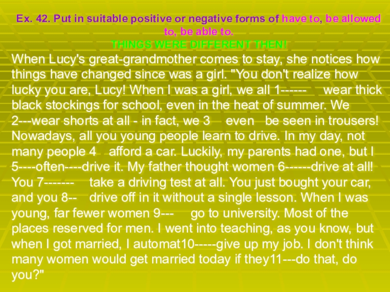 When Lucy's great-grandmother comes to stay, she notices how things have changed since was a girl. "You don't realize how lucky you are, Lucy! When I was a girl, we all 1------ wear thick black stockings for school, even in the heat of summer. We 2---wear shorts at all - in fact, we 3 even be seen in trousers! Nowadays, all you young people learn to drive. In my day, not many people 4 afford a car. Luckily, my parents had one, but I 5----often----drive it. My father thought women 6------drive at all! You 7------- take a driving test at all. You just bought your car, and you 8-- drive off in it without a single lesson. When I was young, far fewer women 9--- go to university. Most of the places reserved for men. I went into teaching, as you know, but when I got married, I automat10-----give up my job. I don't think many women would get married today if they11---do that, do you?"