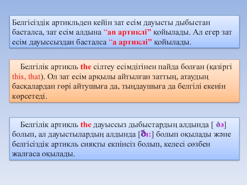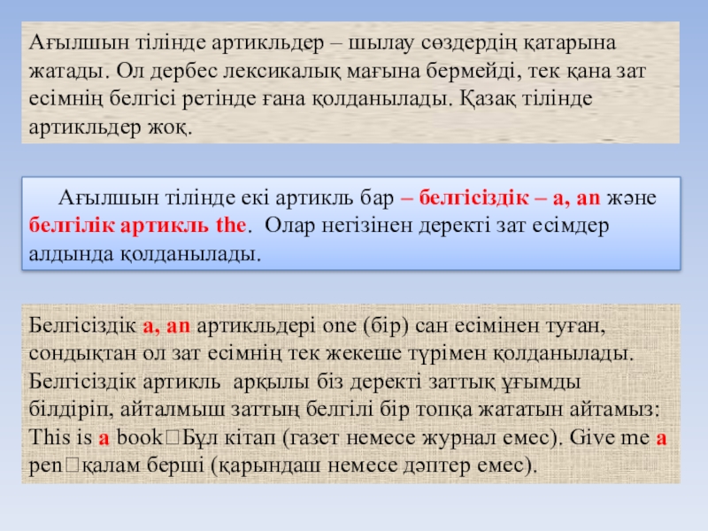 Ағылшын тілінде екі артикль бар – белгісіздік – a, an және белгілік артикль the. Олар негізінен деректі зат есімдер алдында қолданылады.