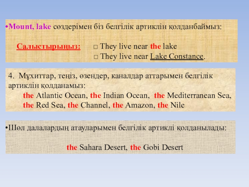 4. Мұхиттар, теңіз, өзендер, каналдар аттарымен белгілік артиклін қолданамыз: