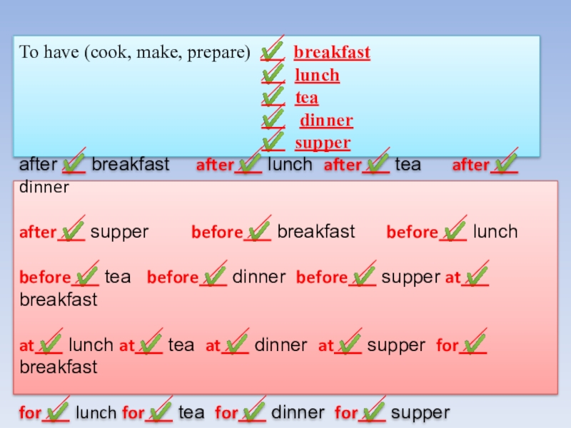 before ✔ tea before ✔ dinner before ✔ supper at ✔ breakfast