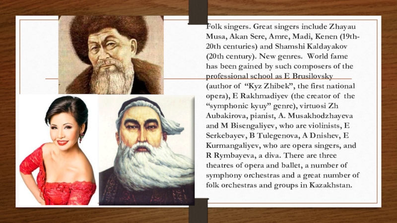 Kenen (19th- 20th centuries) and Shamshi Kaldayakov (20th century). New genres. World fame has been gained by such composers of the professional school as E Brusilovsky (author of “Kyz Zhibek”, the first national opera), E Rakhmadiyev (the creator of the “symphonic kyuy” genre), virtuosi Zh Aubakirova, pianist, A. Musakhodzhayeva and M Bisengaliyev, who are violinists, E Serkebayev, B Tulegenova, A Dnishev, E Kurmangaliyev, who are opera singers, and R Rymbayeva, a diva. There are three theatres of opera and ballet, a number of symphony orchestras and a great number of folk orchestras and groups in Kazakhstan.