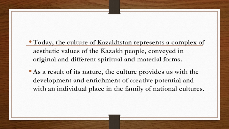 Слайд 17Today, the culture of Kazakhstan represents a complex of aesthetic values