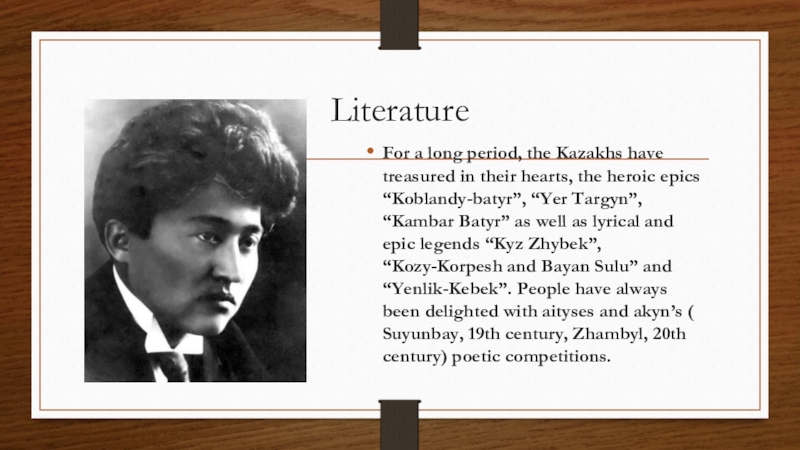 hearts, the heroic epics “Koblandy-batyr”, “Yer Targyn”, “Kambar Batyr” as well as lyrical and epic legends “Kyz Zhybek”, “Kozy-Korpesh and Bayan Sulu” and “Yenlik-Kebek”. People have always been delighted with aityses and akyn’s ( Suyunbay, 19th century, Zhambyl, 20th century) poetic competitions.