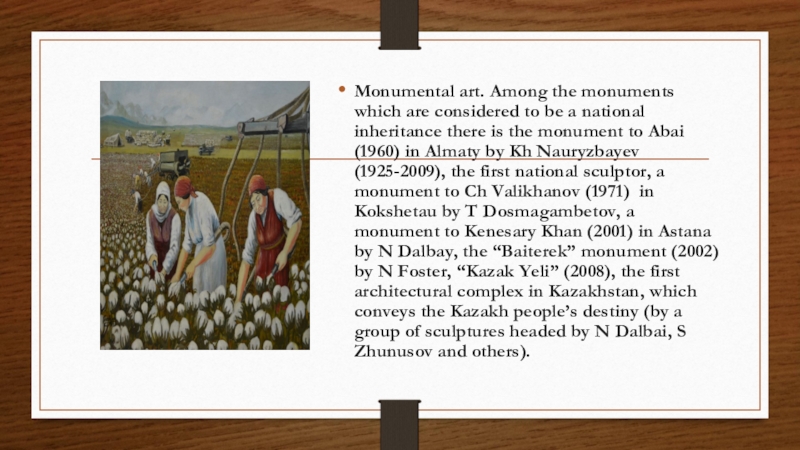 national inheritance there is the monument to Abai (1960) in Almaty by Kh Nauryzbayev (1925-2009), the first national sculptor, a monument to Ch Valikhanov (1971) in Kokshetau by T Dosmagambetov, a monument to Kenesary Khan (2001) in Astana by N Dalbay, the “Baiterek” monument (2002) by N Foster, “Kazak Yeli” (2008), the first architectural complex in Kazakhstan, which conveys the Kazakh people’s destiny (by a group of sculptures headed by N Dalbai, S Zhunusov and others).