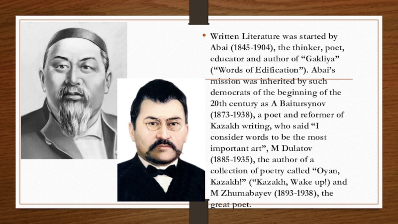 and author of “Gakliya” (“Words of Edification”). Abai’s mission was inherited by such democrats of the beginning of the 20th century as A Baitursynov (1873-1938), a poet and reformer of Kazakh writing, who said “I consider words to be the most important art”, M Dulatov (1885-1935), the author of a collection of poetry called “Oyan, Kazakh!” (“Kazakh, Wake up!) and M Zhumabayev (1893-1938), the great poet.