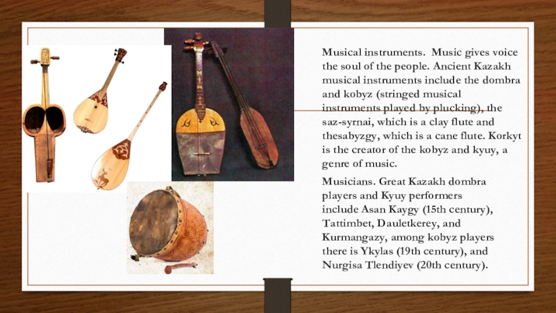 Kazakh musical instruments include the dombra and kobyz (stringed musical instruments played by plucking), the saz-syrnai, which is a clay flute and thesabyzgy, which is a cane flute. Korkyt is the creator of the kobyz and kyuy, a genre of music.
