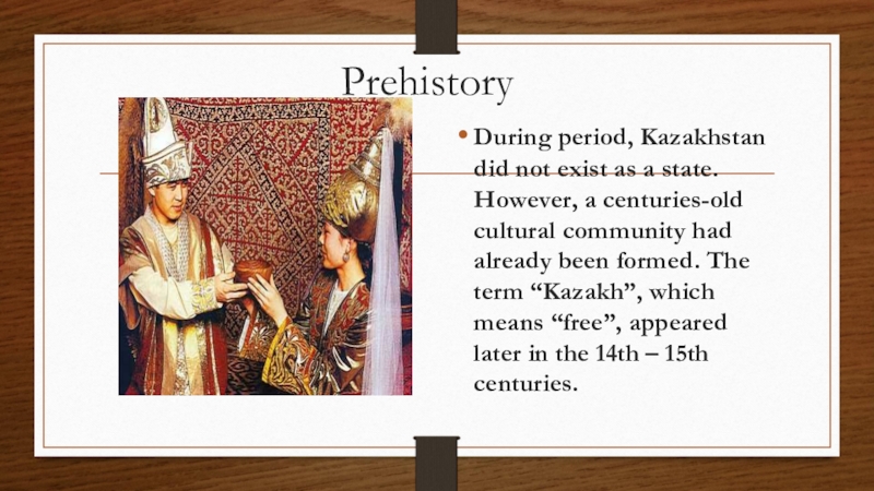 centuries-old cultural community had already been formed. The term “Kazakh”, which means “free”, appeared later in the 14th – 15th centuries.