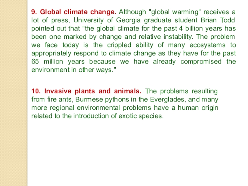 10. Invasive plants and animals. The problems resulting from fire ants, Burmese pythons in the Everglades, and many more regional environmental problems have a human origin related to the introduction of exotic species.