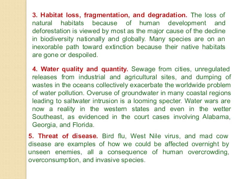 5. Threat of disease. Bird flu, West Nile virus, and mad cow disease are examples of how we could be affected overnight by unseen enemies, all a consequence of human overcrowding, overconsumption, and invasive species.