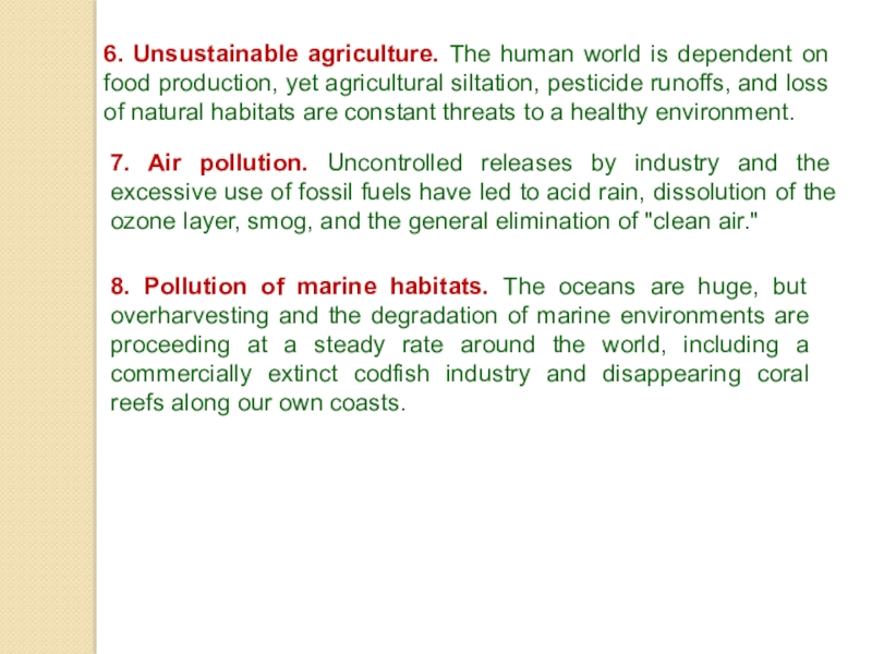8. Pollution of marine habitats. The oceans are huge, but overharvesting and the degradation of marine environments are proceeding at a steady rate around the world, including a commercially extinct codfish industry and disappearing coral reefs along our own coasts.