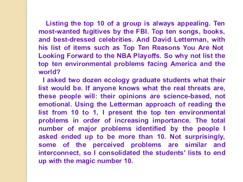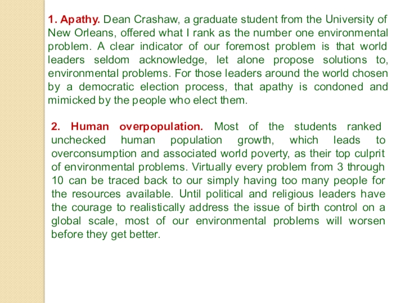 2. Human overpopulation. Most of the students ranked unchecked human population growth, which leads to overconsumption and associated world poverty, as their top culprit of environmental problems. Virtually every problem from 3 through 10 can be traced back to our simply having too many people for the resources available. Until political and religious leaders have the courage to realistically address the issue of birth control on a global scale, most of our environmental problems will worsen before they get better.