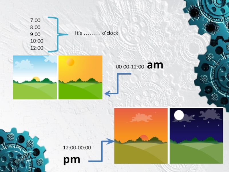 7:008:009:0010:0012:00It’s ……… o’clock00:00-12:00 am12:00-00:00 pm