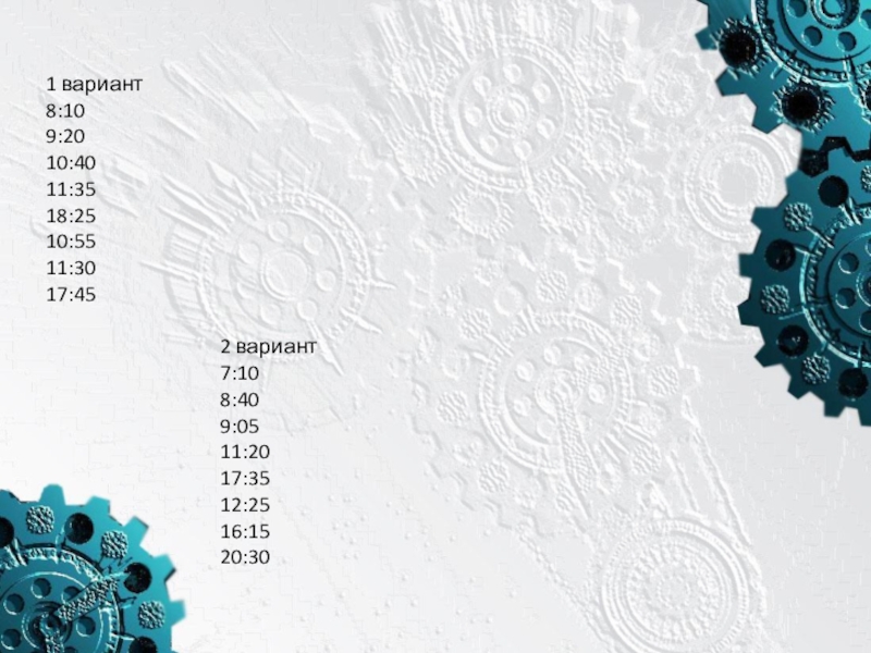 1 вариант8:109:2010:4011:3518:2510:5511:3017:45				2 вариант				7:10				8:40				9:05				11:20				17:35				12:25				16:15				20:30
