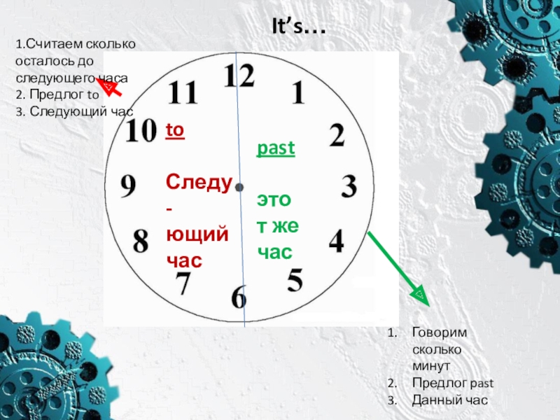 past этот же часtoСледу-ющий час1.Считаем сколько осталось до следующего часа2. Предлог to3. Следующий часГоворим сколько минутПредлог pastДанный
