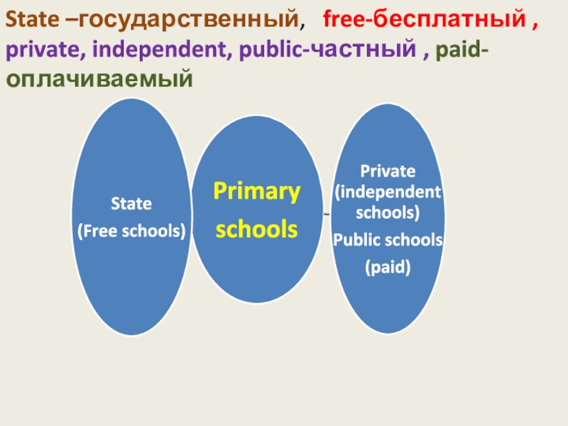 Слайд 1State –государственный, free-бесплатный , private, independent, public-частный , paid-оплачиваемый