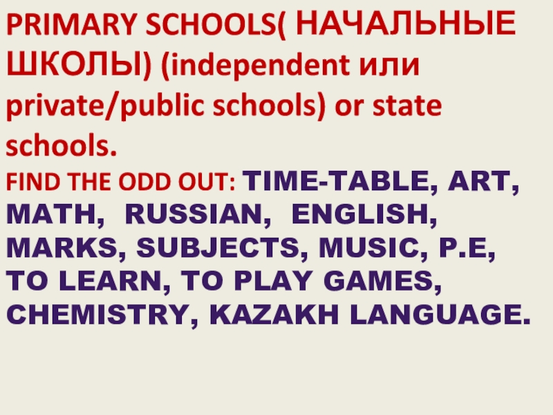 Primary schools( начальные школы) (independent или private/public schools) or state schools.Find the odd out: time-table, art, math, russian, english, marks, subjects, music, p.e, to learn, to play games, chemistry, kazakh language.