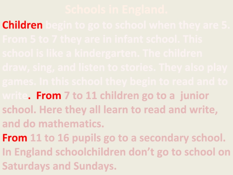 From 5 to 7 they are in infant school. This school is like a kindergarten. The children draw, sing, and listen to stories. They also play games. In this school they begin to read and to write. From 7 to 11 children go to a junior school. Here they all learn to read and write, and do mathematics.