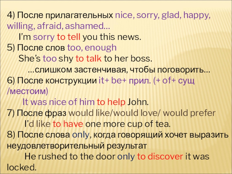 Слайд 34) После прилагательных nice, sorry, glad, happy, willing, afraid, ashamed…
