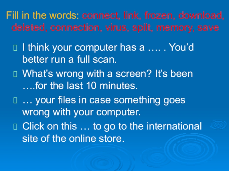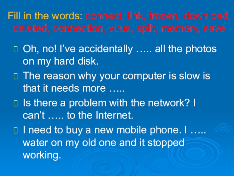 I need to buy a new mobile phone. I ….. water on my old one and it stopped working.