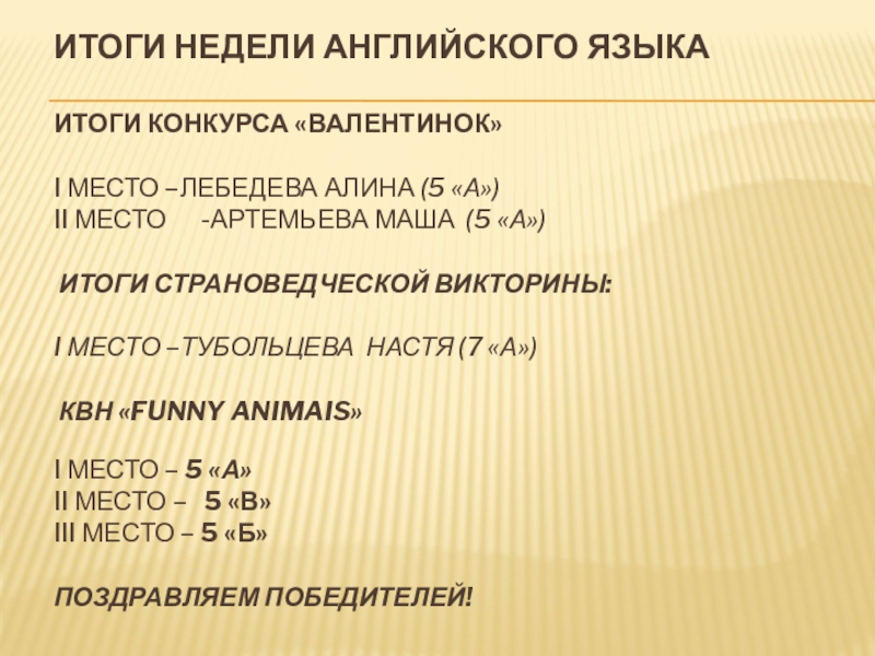 Итоги НЕДЕЛИ АНГЛИЙСКОГО ЯЗЫКА   ИТОГИ КОНКУРСА «ВАЛЕНТИНОК»  I место –лебедева алина (5 «а») II место
