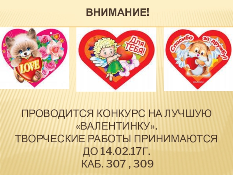 Слайд 4 ВНИМАНИЕ! Проводится конкурс на лучшую «валентинку». Творческие работы принимаются до 14.02.17г.