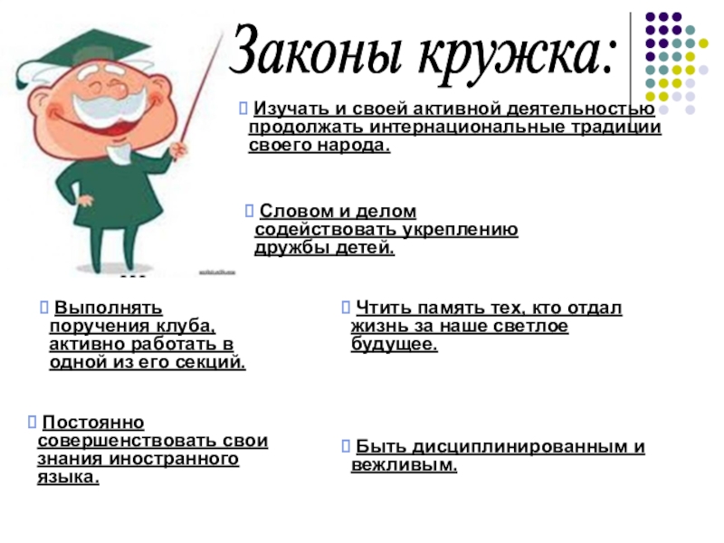 Выполнять поручения клуба, активно работать в одной из его секций.