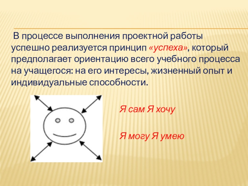 Слайд 12 В процессе выполнения проектной работы успешно реализуется принцип «успеха», который