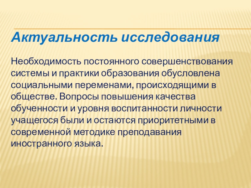 происходящими в обществе. Вопросы повышения качества обученности и уровня воспитанности личности учащегося были и остаются приоритетными в современной методике преподавания иностранного языка.