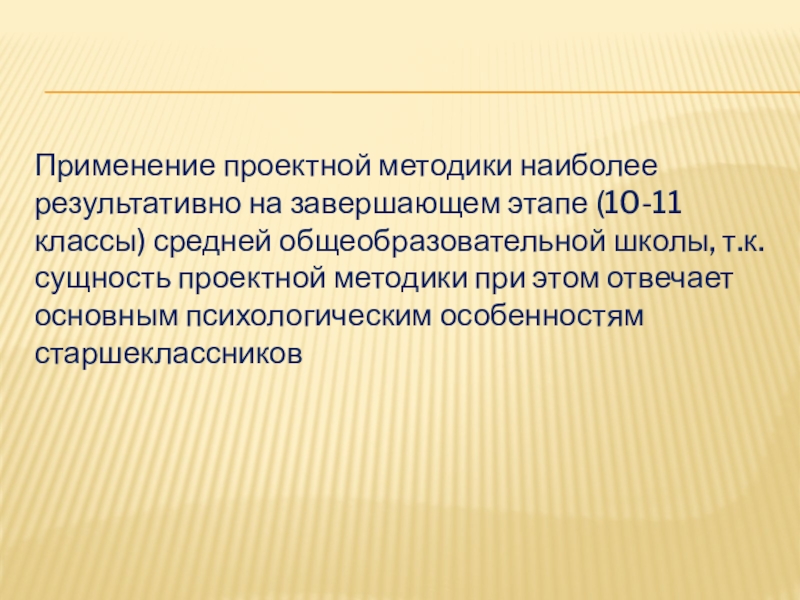 Слайд 13Применение проектной методики наиболее результативно на завершающем этапе (10-11 классы) средней